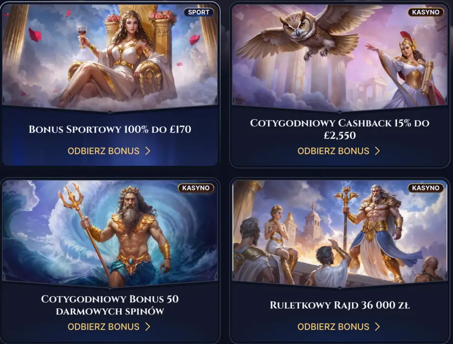 Cazeus Casino oferuje wciągające doświadczenie użytkownika, które umiejętnie łączy starożytno-grecki motyw z nowoczesnymi zasadami designu. Po wejściu na stronę internetową, użytkownicy są witani wizualnie oszałamiającym interfejsem, który uchwyca esencję greckiej mitologii. Paleta kolorów dominująco składa się z bogatych złotych odcieni, głębokich niebieskich tonów i ziemistych barw, przypominających starożytne świątynie i krajobrazy, które budzą poczucie wielkości i historii.
